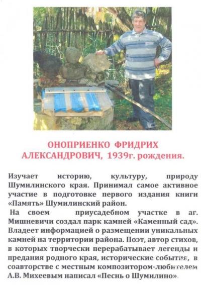 Об увлечениях людей «золотого возраста» рассказала выставка «Праздник творчества и фантазии», представленная 1 октября Шумилинским историко - краеведческим музеем в фойе районного центра культуры в рамках проведения мероприятий ко Дню пожилых людей. На выставке была представлена подборка поэтических сочинений жительниц райцентра Половниковой Екатерины Фоминичны - председателя РО БелОО ветеранов, активистов ветеранского движения Савинковой Аллы Ефимовны, Яковлевой Марии Яковлевны, а также местного краеведа Оноприенко Фридриха Александровича и переселенки из г. Макеевка Донецкой области Середенко Раисы Васильевны, проживающих в аг. Мишневичи. Строки стихотворений авторов наполнены искренностью, в них отображен жизненный опыт, гордость за свою страну, свой край. Поэтические сочинения не оставили равнодушным ни одного посетителя выставки.